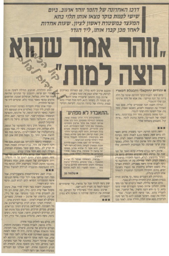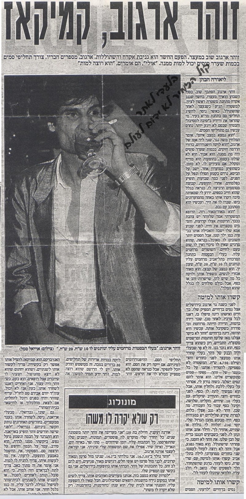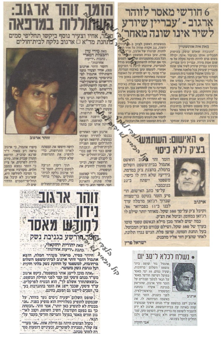 כתבות לפניכם מקובצות כתבות מקוריות, מהעיתון ומרחבי האינטרנט על זוהר ארגוב. כל החומרים הסרוקים נערכו במיוחד לאתר קול הזמיר לא ידום לעולם. שובר שורות יהודה נוריאל מביא את הסיפורים שמאחורי 15 השירים הכי גדולים של המלך. פורסם במוסף שבעה ימים של ידיעות אחרונות 30.8.19 אמו של זוהר ארגוב זועקת שער העיתון "העולם הזה" מתאריך 11.11.1987. חמישה ימים בלבד לאחר מותו של זוהר. בלעדי לאתר קול הזמיר לא ידום לעולם מות הזמיר בלהיטון כתבה ענקית על זוהר ארגוב מתאריך 11.11.1987 מהעיתון להיטון. מסכמת ומספרת את סיפור חייו של המלך הוא לא התאבד כתבת ענק מהימים הראשונים שלאחר המוות. מסכמת את מסע הלוויה ואת התקופה האחרונה בחייו וכוללת ראיונות עם קרובי משפחה וחברים. האישה שאיתו ראיון עם ברכה צוברי, גרושתו של זוהר. פורסם בעיתון לאישה בתאריך 23.11.1987. מספרת על החיים לצד המלך ועל מותו הפתאומי פרסומות בעיתון פרסומות לקלטת "המלך" של טל הפקות ול"מיטב להיטי הזהב" של האחרים ראובני. פורסם לאחר מותו בעיתון להיטון, ב-1988 ו-1989. מלחמת הזכויות שלוש כתבות שפורסמו זמן קצר לאחר מותו של זוהר וממחישות את מאבק התמלוגים הגדול בין האחים ראובני, ניסים בן חיים ומשפחת ארגוב. עד שבא זוהר כתבה שפורסמה בספטמבר 1997 במוסף שבעה ימים של ידיעות אחרונות ובה מעלים מאיר ראובני וננסי ברנדס , בין היתר, זיכרונות מהמלך. קצה הכאב כתבה מיום ראשון שלאחר המוות. מגוללת את סיפור ההצלחה הגדולה, הנפילה והמוות וכוללת גם תגובות מפורסמים. בצער רב וביגון קודר אוסף של ארבע כתבות על זוהר שפורסמו בעיתונים שונים. פורסמו זמן קצר מאוד לאחר מותו של זוהר מסתבך עם החוק כתבות על ההסתבכויות של זוהר עם החוק. הכתבות מספרות על השתוללות במרפאה, שימוש בצ'ק ללא כיסוי, גניבת נשק והרשעה בבית משפט. תנו לו יד פורסם פחות מחודשיים לפני מותו של זוהר. חבר לתא המעצר מספר על זוהר ועל העתיד שהוא צופה לו. איך עברו השנים כתבה ע-נ-ק-י-ת בת 12 עמודים מעיתון כל הדרום המגוללת את סיפור חייו המלא . פורסמה לרגל שלוש שנים למותו של זוהר. מומלץ מאוד לקריאה זוהר אמר שהוא רוצה למות פרסום מהעיתון אודות מותו של זוהר ארגוב וסיכום השעות האחרונות ומסע ההלוויה של המלך. בלעדי לאתר קול הזמיר אני זה גילי, לא אחקה אותו ראיון עם גילי ארגוב, אז בן 16, שטען כי הוא לא יחקה את אביו בשימוש בסמים. בלעדי לאתר קול הזמיר לא ידום לעולם התחיל לשיר בבית הכנסת כתבה קצרה על זוהר וראיון עם איריס גבאי, חברתו של ישי לוי דאז ואשתו היום, שהתלוננה על זוהר במשטרה זמן קצר לפני שמת. לא היה לו כח לעוד משפט מספר כתבות מתוך העיתון חדשות מיום ראשון, ה-8.11.1987. הכתבות מספרות את הסיפור של המלך - בלעדי לאתר קול הזמיר זוהר ארגוב קמיקז כתבה נדירה זמן קצר לפני מותו של זוהר בה אומר אחד החברים שלו שאולי הוא רוצה למות - בלעדי לאתר קול הזמיר לא ידום לעולם גליון הרשעות הנה לפניכם גליון ההרשעות המלא והלא מחמיא במיוחד של זוהר ארגוב. פורסם ברשת מקומוני זמן של עיתון מעריב באוקטובר 2007. הלילה האחרון מה באמת קרה בתא המעצר ב-24 השעות האחרונות בחייו של וכיצד באה לקיצה אגדת זוהר ארגוב? פורסם בעיתון תל אביב, שנת 2003 בצל הזוהר זהו סרט דוקומנטרי הבודק את ההערצה סביב זוהר ארגוב ומלווה כשרונות צעירים בדרך לתחרות שירה לזכרו של המלך. פורסם ב-ynet שלוש שנים למותו סיכום המופע לציון שלוש שנים למותו של זוהר ארגוב שנערך בבנייני האומה בירושלים, שנת 1990. נכתב ונערך במיוחד לאתר קול הזמיר חמש עשרה שנה למותו סיכום מופע "איך עברו השנים" לציון יום השנה החמישה עשר למותו של זוהר ארגוב בהנחיית ירון אילן. נכתב ונערך במיוחד לאתר קול הזמיר הפרח בגני - משדר מיוחד ברדיו משדר מיוחד ברדיו שערך והגיש ליאור פרידמן ובו ראיונות, שירים וסיפורים על המלך. נכתב ונערך במיוחד לאתר קול הזמיר הרגעים האחרונים קצינים בכירים מספרים על הרגעים האחרונים של זוהר ארגוב ועל מסכת היחסים המיוחדת שהייתה להם עמו. פורסם בזמנים מודרניים 1992 קרב 